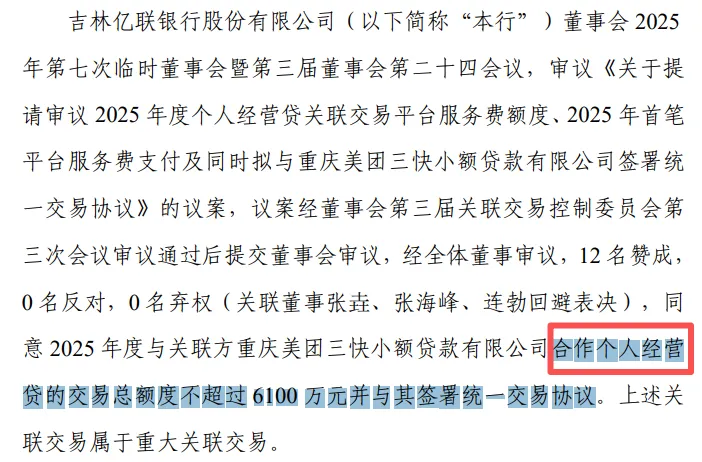 禾金财经查找亿联银行8月份发布的关联交易事项的公告,只提到了2025年度个人经营贷关联交易额度,为不超过6100万。