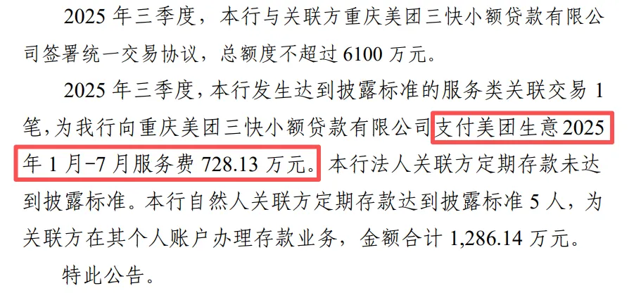 三季度,亿联银行发生达到披露标准的服务类关联交易1笔,为向重庆美团三块小额贷款有限公司(下称美团小贷)支付美团生意2025年1月-7月服务费728.13万元。
