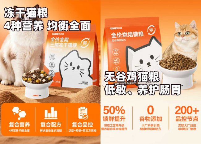 两款都是全价粮,从小猫到老猫都能吃。想补身体、长肉的,选三拼冻干;要是肠胃特别敏感、容易软便的,无谷鸡烘焙。