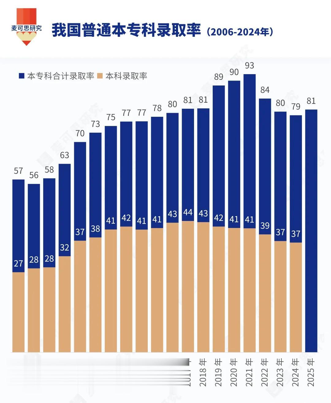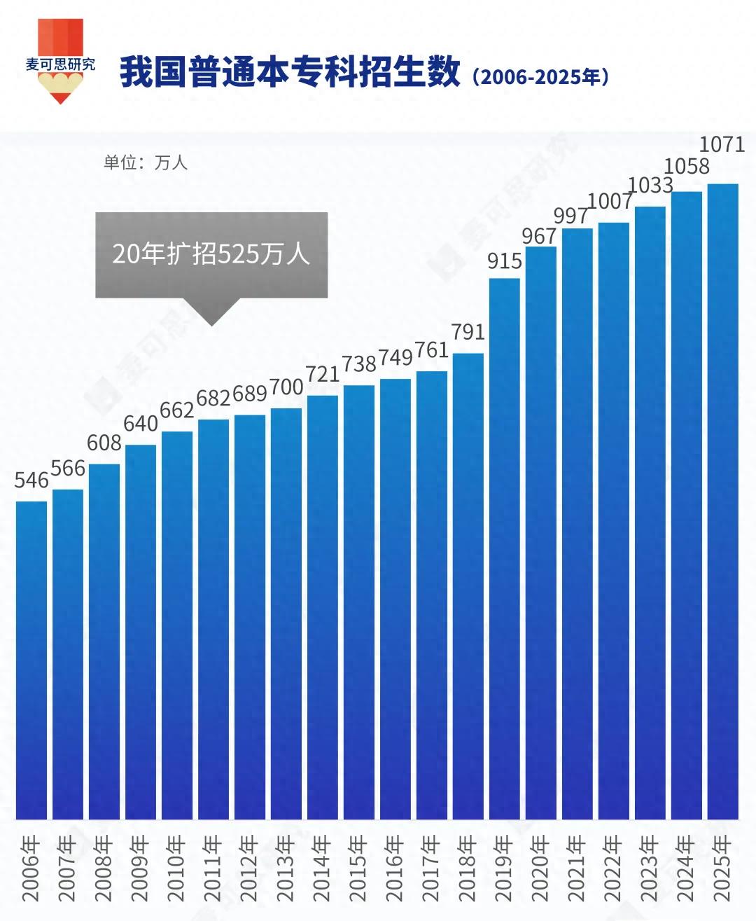事实上,扩招一直是高等教育招生的主旋律,以普通高校本科招生人数为例,20余年来,全国本专科合并招生人数始终保持持续增长态势。教育部统计数据显示,2006年全国本专科合计招生规模仅为546万人,此后逐年稳步攀升,2025年已增长至1071万人,较2006年增长近一倍,实现了招生规模的翻倍式跨越。
