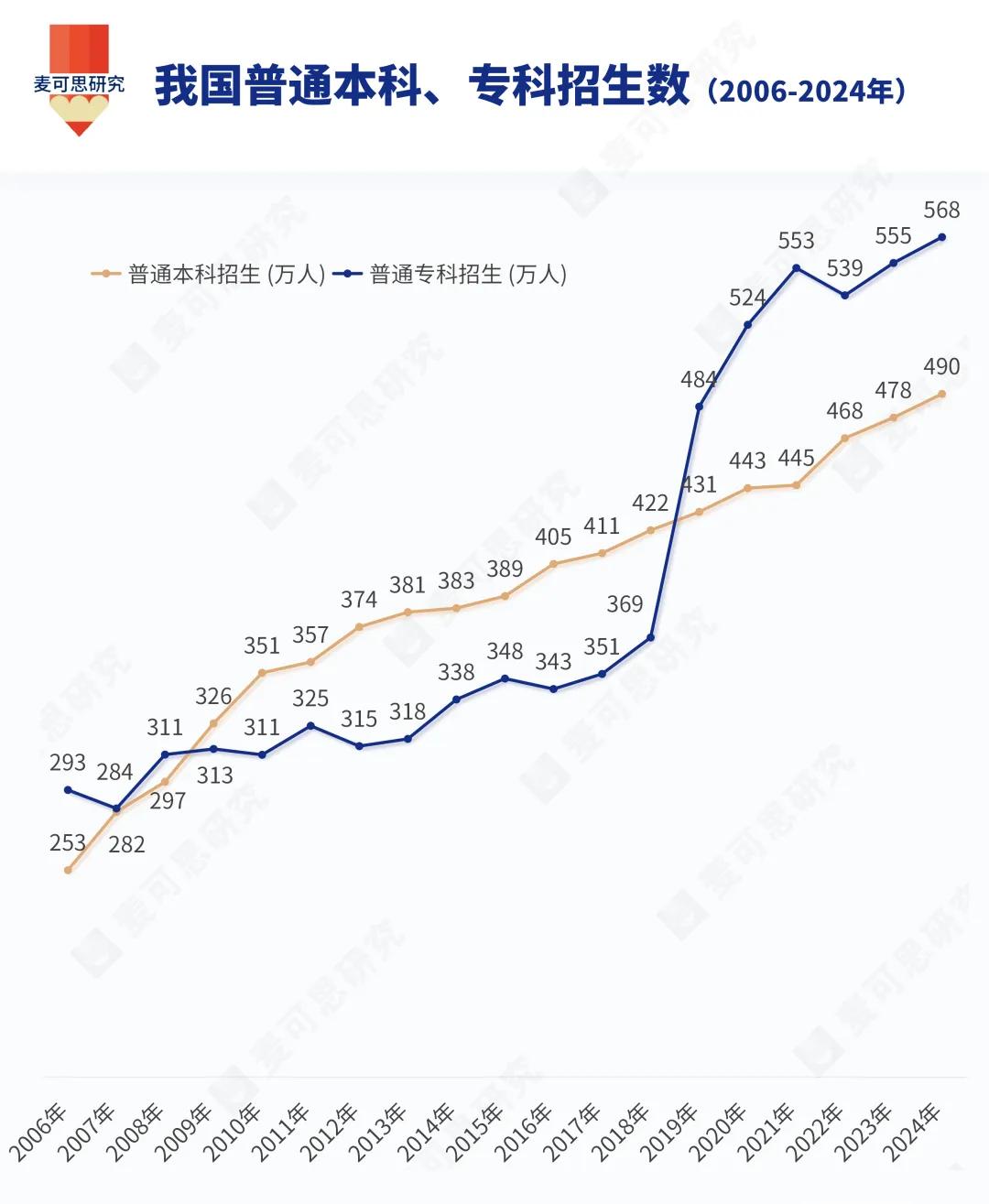 再来看本科招生,近20年本科招生规模同样保持长期增长,但近几年也面临录取率持续回落的现实问题。2006年全国普通本科招生人数仅为253万人,2024年已增长至490万人。