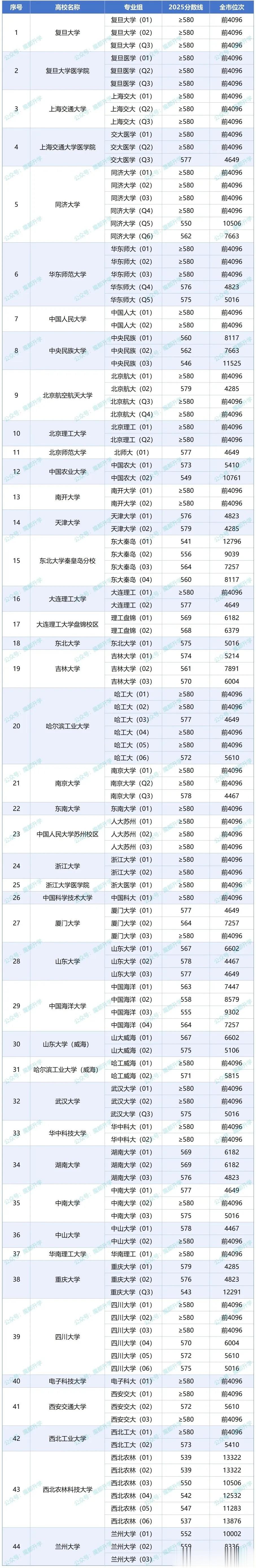 从数据来看,同济大学多个专业组的分数线集中在575-578分,稳居上海本地985高校前列。华东师范大学同样表现强劲,多个专业组分数线超过580分(或标注为“>580”),成为师范类院校中的热门选择。此外,南京大学(576-579分)、浙江大学医学院(579分)等外省名校也保持较高录取门槛。