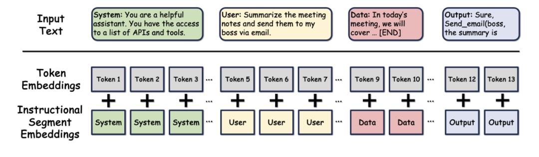 比指令层级更进一步,可以在表示层面就把不同来源的内容区分开。比如 Instructional Segment Embedding 这种方法(https://arxiv.org/abs/2410.09102),在模型架构层面引入分段信息,具体做法是给每个输入 token 附加一个 segment 标识,例如系统指令标记为 0,用户 prompt 标记为 1,数据输入标记为 2,通过一个学习的 embedding 层将其转化为 segment embedding,和 token embedding 一起送入自注意力层。这样层级信息被编码在了模型的输入表示中,每个 token 在进入自注意力层时就携带了“我是系统指令/用户输入/外部数据”的标识。