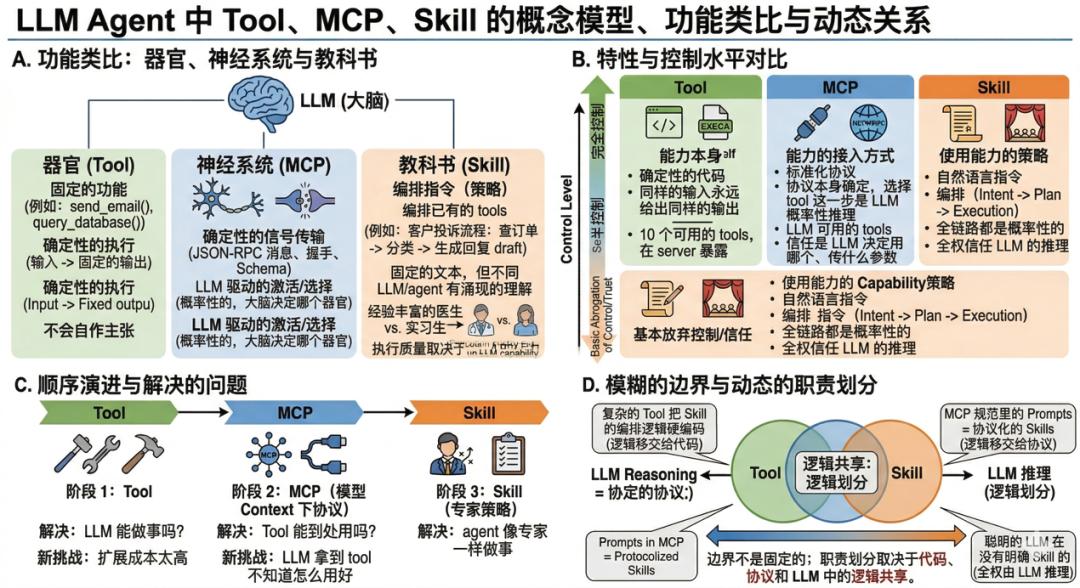 三者的本质区别不在于能不能完成任务,而在于你对执行过程有多少控制力。Tool 给了你完全控制,MCP 给了半控制(协议是确定的,但选择哪个 function/tool 是放权的),Skill 则基本放弃控制、全权信任 LLM 的推理。我们现在选择使用 Skill,某种程度上就是对 LLM 的信任程度更高了。