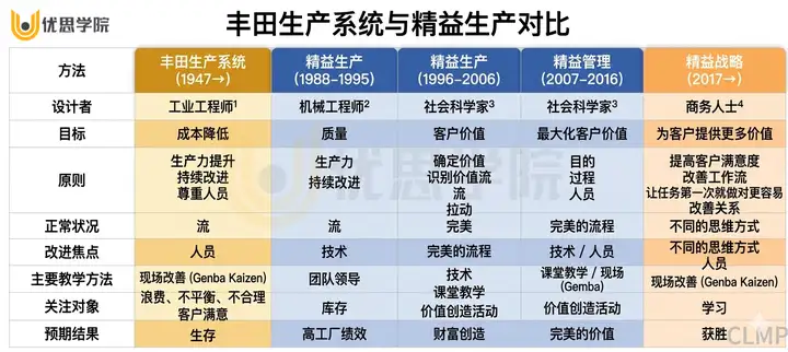 在2017年,埃米利阿尼教授(Professor Bob Emiliani)制作了一个表格从设计者、目标、原则、焦点等等不同的层面分析了TPS、精益生产,和精益管理之间的差异,帮助我们理解它们在理念上的关键区别。