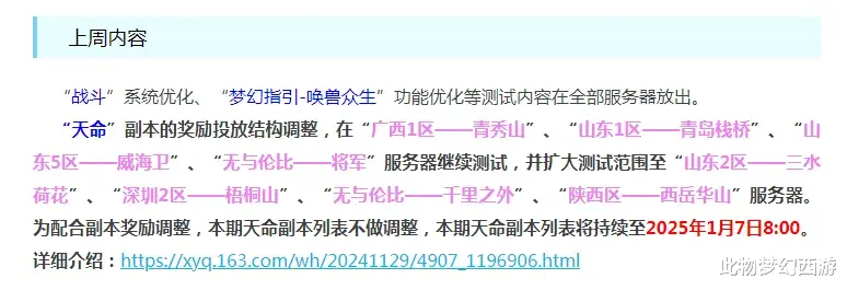 本次维护公告放出后,官方表示天命副本奖励结构将继续测试,并扩大了测试服范围,不知是否会调高奖励,这也是所有日常玩家们说关切的重点。