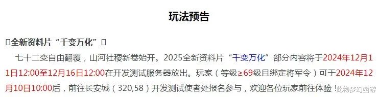 本期维护公告除了天命副本奖励调整继续测试之外,最大的亮点应该就是2025全新资料片“千变万化”将在12月11日至12月16日在开发测试服上线并测试,等级≥69级且绑定将军令的玩家皆可报名参与体验。