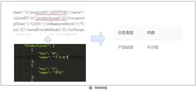 3)枚举类:此类日志内容记录的是一个 key 值,实际用户能理解的是该 key 值所代表的含义,例如产品钻级:0,就需要转换为:“不分级”,这就需要关联枚举值的配置文件进行查询转换。