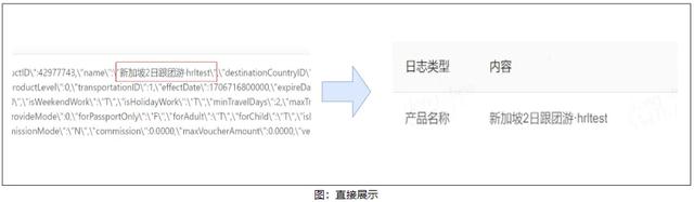 2)数据关联类:此类日志内容中记录的是一个 id,但实际内容存在于另一个关联表的数据中,例如 id:1 表示的是跟团游,不能将 id:1 的日志展示给用户,而需转换为“跟团游”,这就需要进行一步关联 db 表的查询转换。