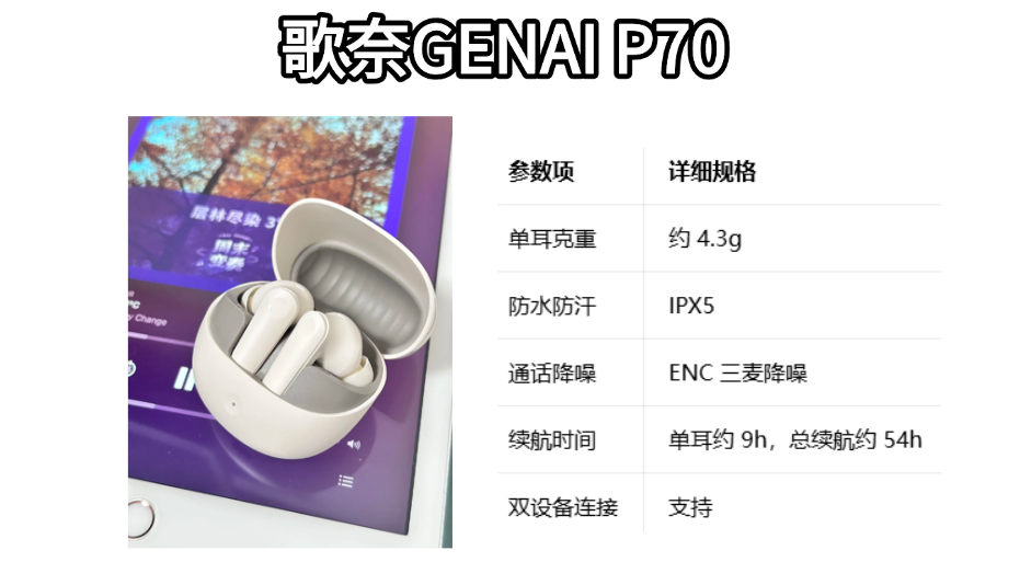 综合下来,各方面最均衡的还是歌奈GENAI P70,160多的价格有蓝牙5.4、13mm镀钛大动圈、36小时总续航,不管是连接稳定性、音质、续航还是佩戴都没有短板,性价比真的拉满。要是对续航和佩戴舒适度有更高要求的,就选歌奈GENAI P40i,12小时单耳续航真的巨省心。要是预算三百多想要最好的降噪和音质,就选REDMI Buds 8 Pro,多单元配置音质真的超顶。预算只有一百多,直接冲Earbuds A Pro,够用还便宜。