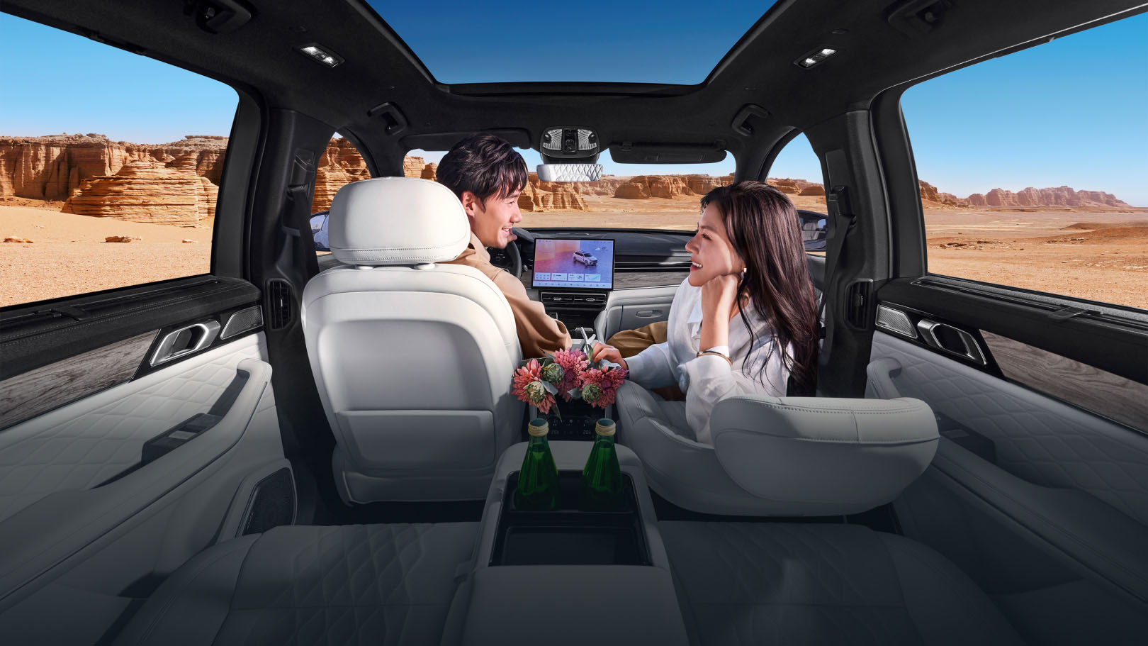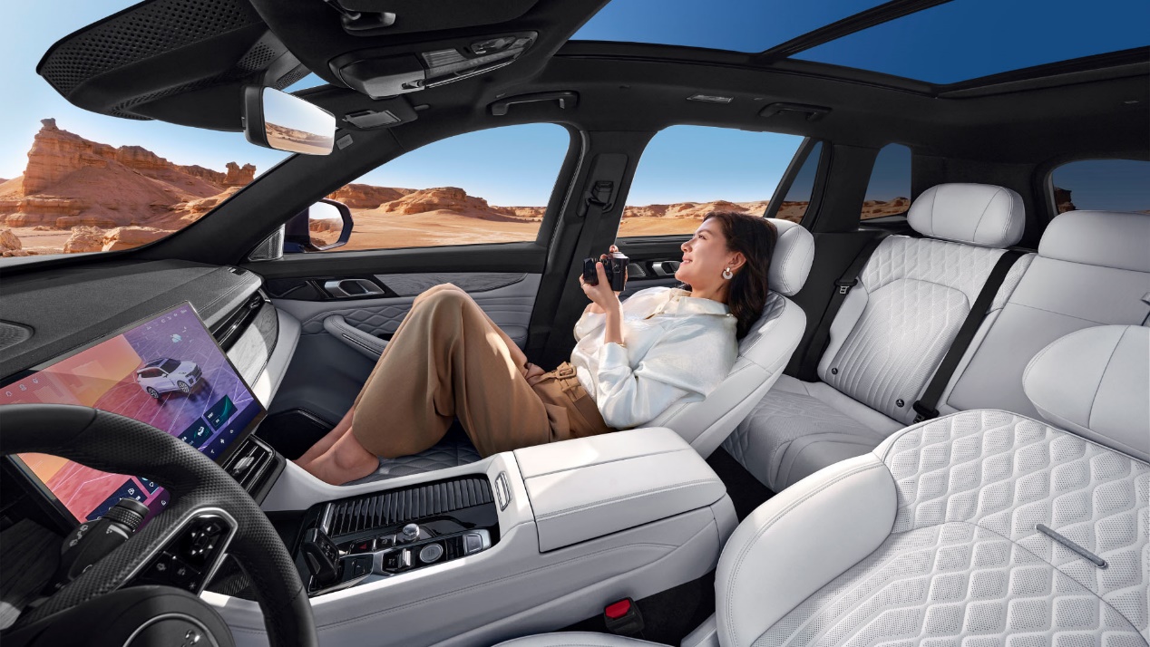 2026款领克09四驱探索版在“坐得舒服”这件事上花了不少心思。它采用大五座布局,二排座椅宽度达到1366mm,坐垫深度为540mm,最大腿部空间有1130mm,即使三人满座也能保证各自的舒适区域。更值得一提的是,此前通常出现在更高级别车型上的通风、加热和8点式背部按摩功能,这次在2026款领克09四驱探索版上实现了前后排四座覆盖。副驾座椅新增了一体式电动腿托,二排则配备了多功能中央扶手和小桌板。这些配置共同打造了一个注重全员体验的乘坐空间。空间灵活性也值得一说,后排座椅放倒后,后备箱容积可从691L扩展至1522L,能轻松容纳大量行李或变身一张临时大床。前排座椅靠背还能放倒与二排连接形成“双人沙发床”模式,扩展了车内休憩的可能性。