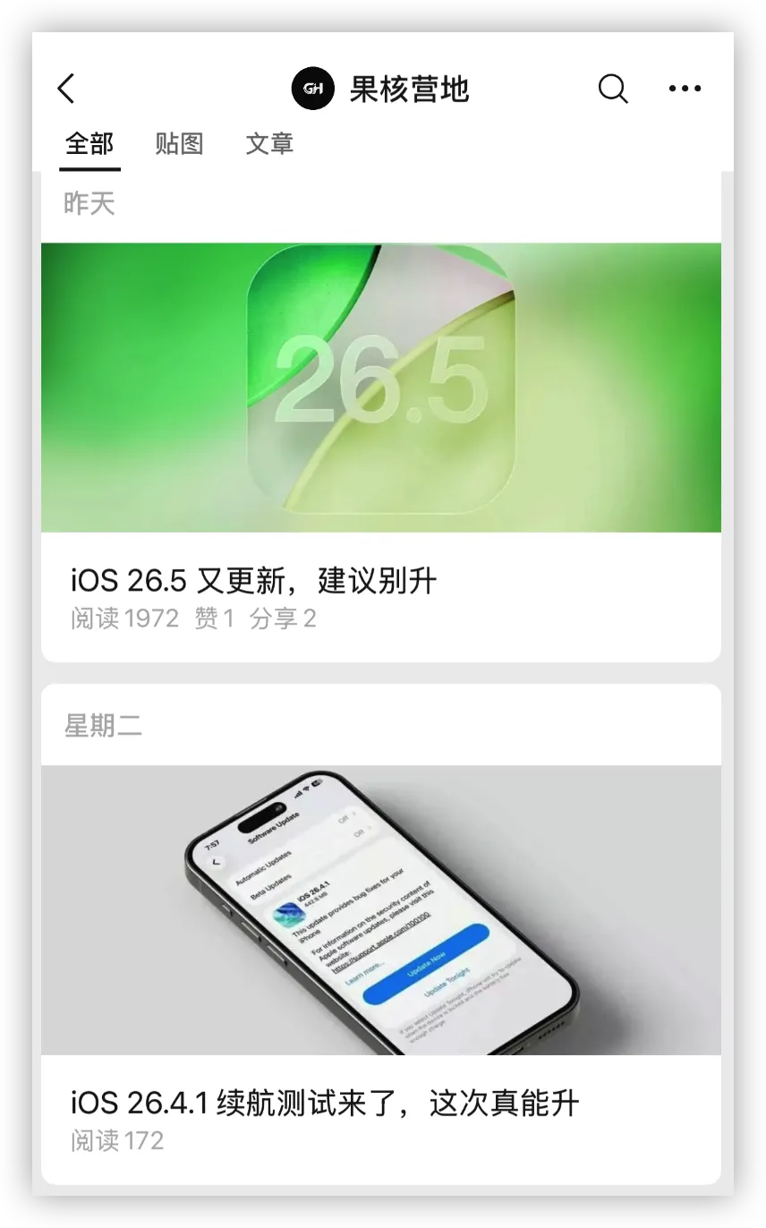以前是小小的方形封面图配标题,现在直接展示文章的完整大封面,和用户在订阅号列表里看到的效果一样。