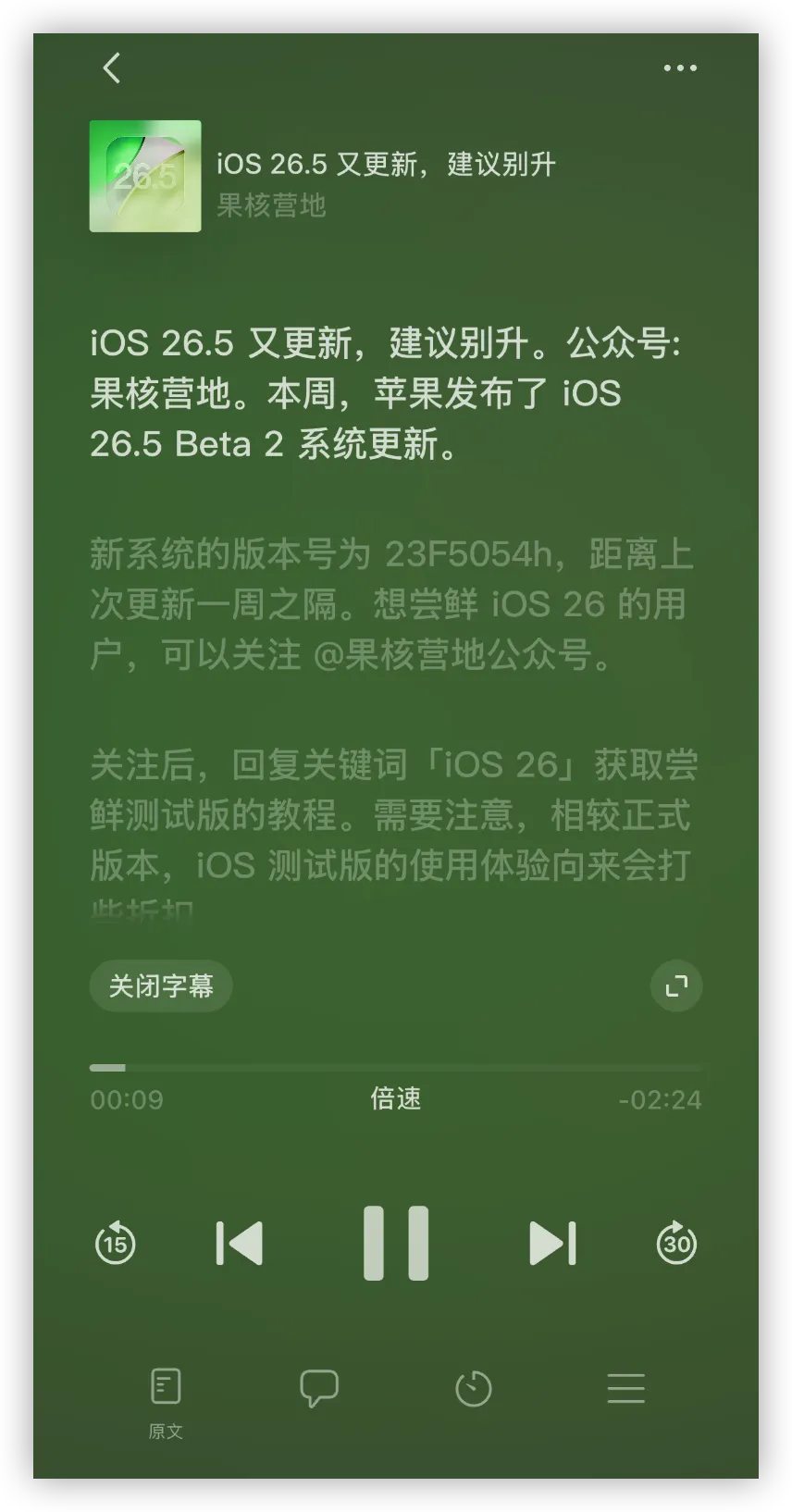 现在点击文章顶部的耳机图标,除了听,还能实时看字幕了。