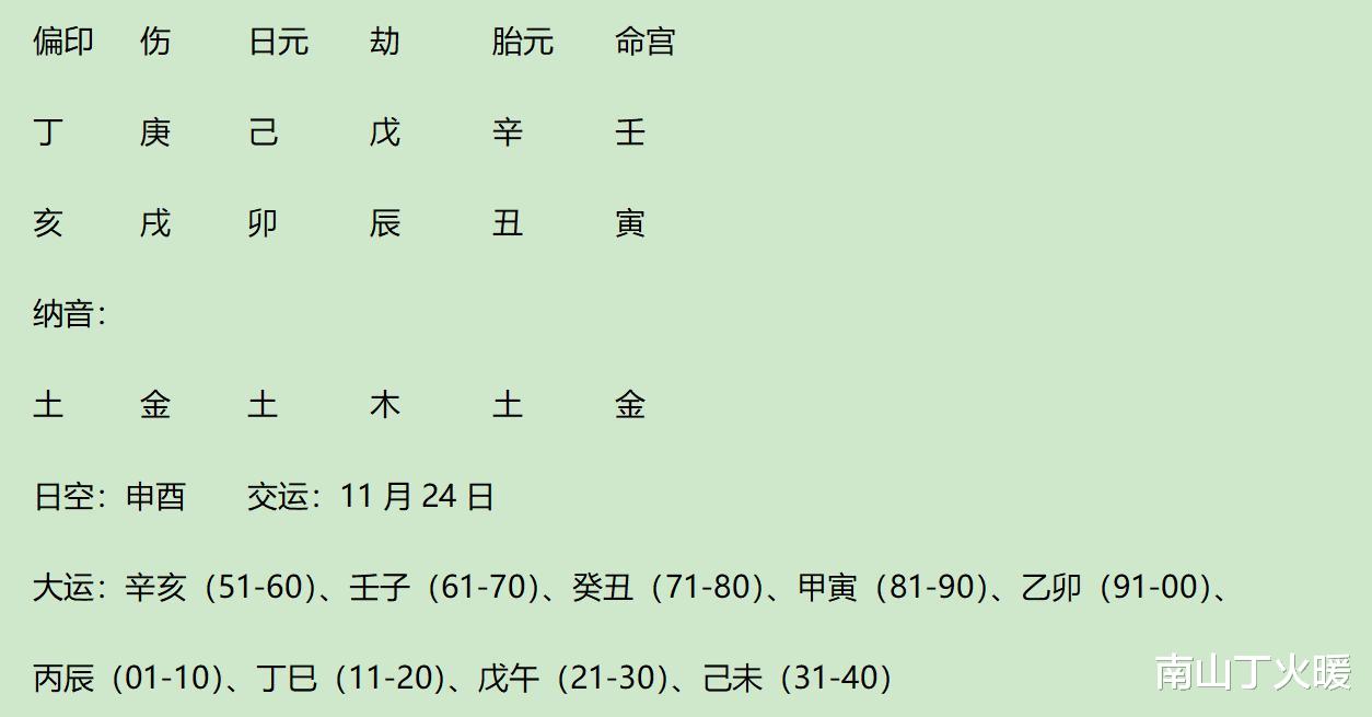 胎元透辛食,命宫透壬正财,为食神生财格。