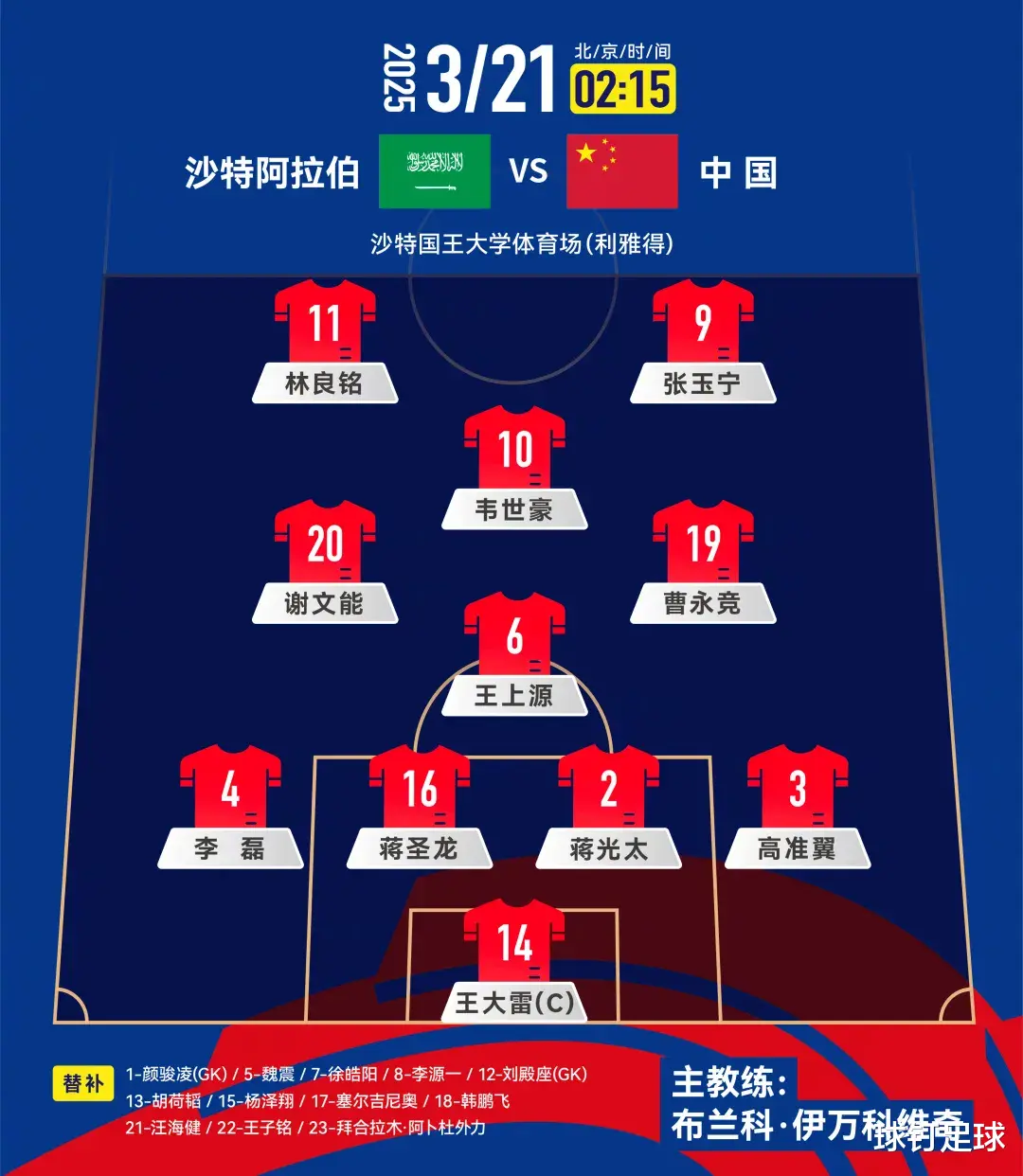 果不其然,伊万科维奇再次采用了442菱形中场阵型,林良铭和张玉宁出任双前锋,身后是韦世豪、谢文能、曹永竞、王上源。李磊、蒋圣龙、蒋光太和高准翼组成四后卫,门将依然是队长王大雷。