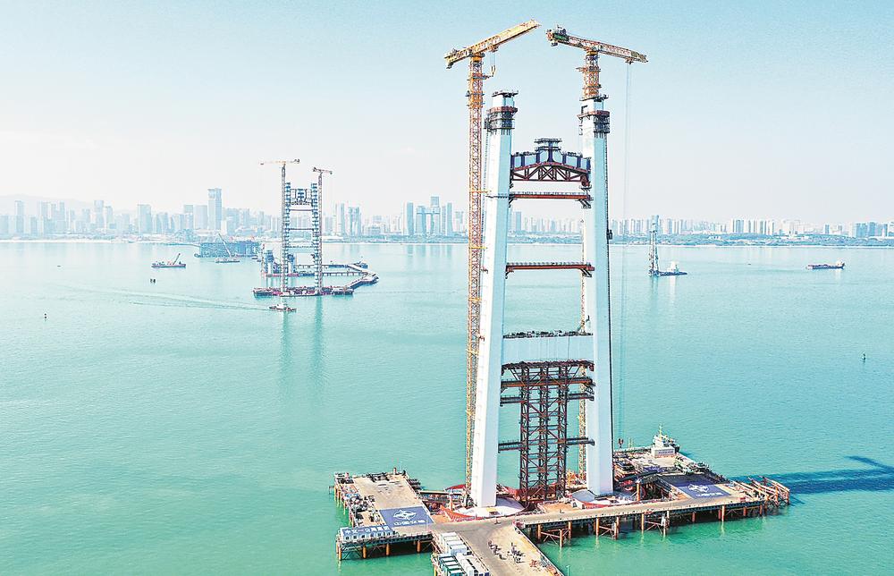 福建日报讯 (记者 林梓健 文/图) 12月1日,随着最后一个钢壳精准吊装到位,厦金大桥厦门段关键控制性工程刘五店航道桥主塔顺利封顶。这一里程碑式进展,标志着大桥建设正式从“立塔成型”转入“悬索成桥”阶段,为后续主缆架设、钢箱梁吊装等核心工序筑牢基础。