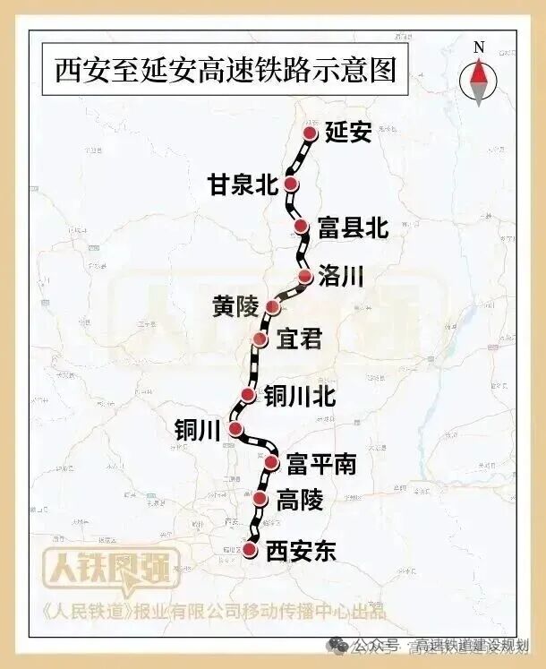 西安东—延安,全长约299km,时速350km/h,是陕北第一条通车的350km/h高铁。