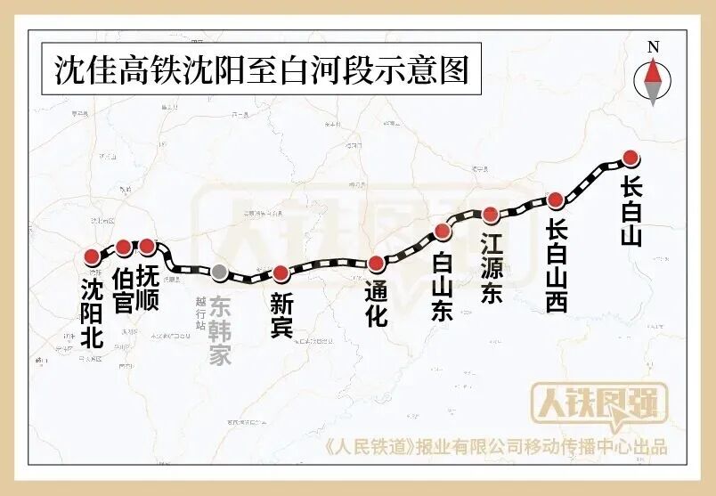 沈阳北—长白山,全长约428km,时速350km/h,也是辽宁抚顺、吉林通化等地,第一条通车的高铁 。