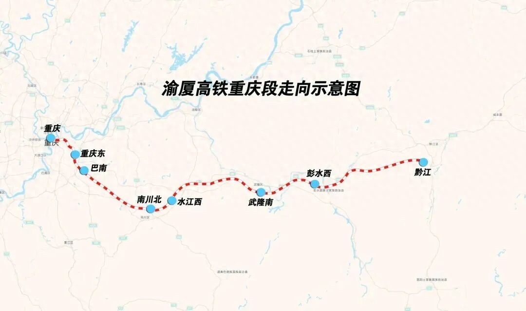 项目全长约265km,时速350km/h,重庆东—黔江,渝厦高铁重庆至长沙段贯通。