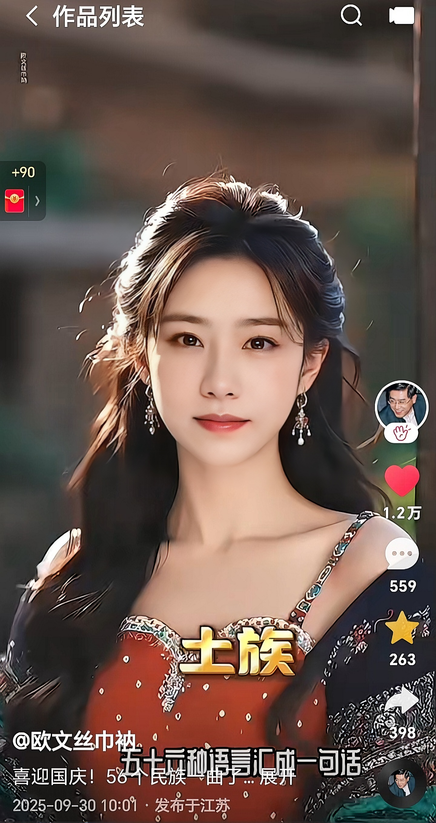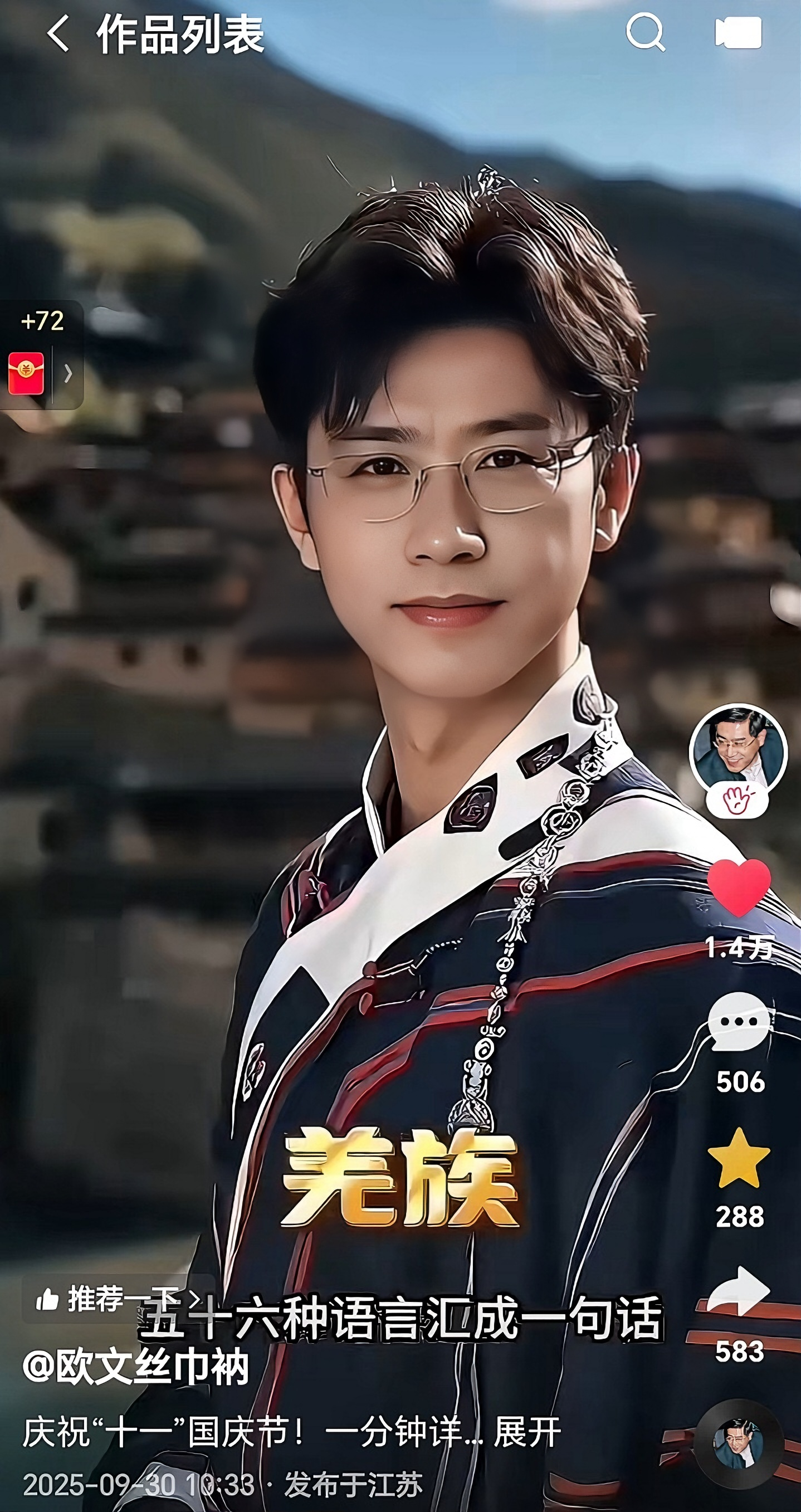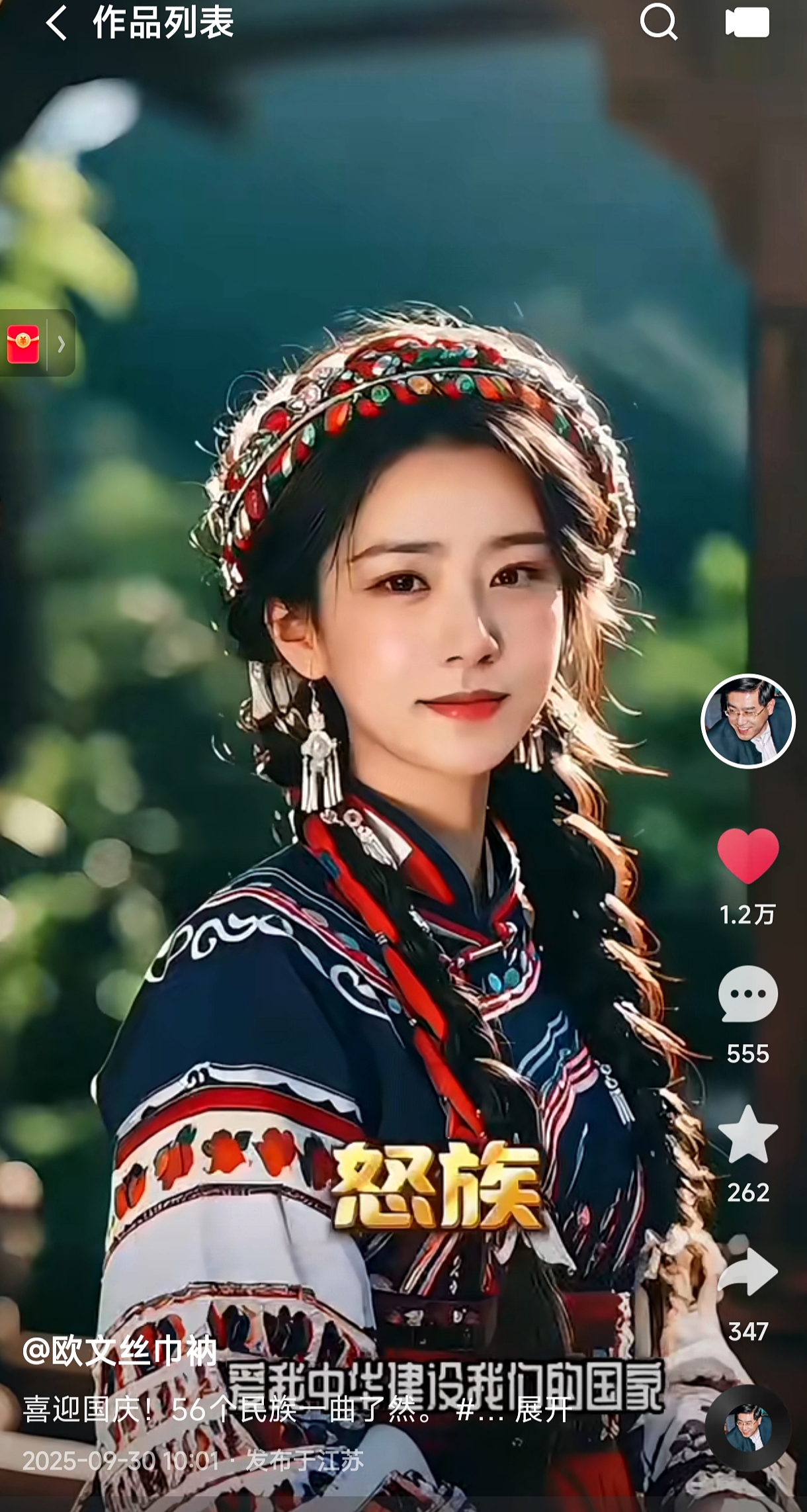 国庆期间,《一分钟详识56个民族》(男版)和《56个民族一曲了然》(女版)两个一分钟视频,伴随《五十六个民族五十六枝花》的熟悉歌声屡上热门,全网播放近50万次,点赞、评论、收藏、转发、弹幕逾四万人次,好评连连。视频作者是跨界心理学家欧文丝巾衲,男版和女版均由其个人AI形象生成,被称为“56对民族玛姆斯”
