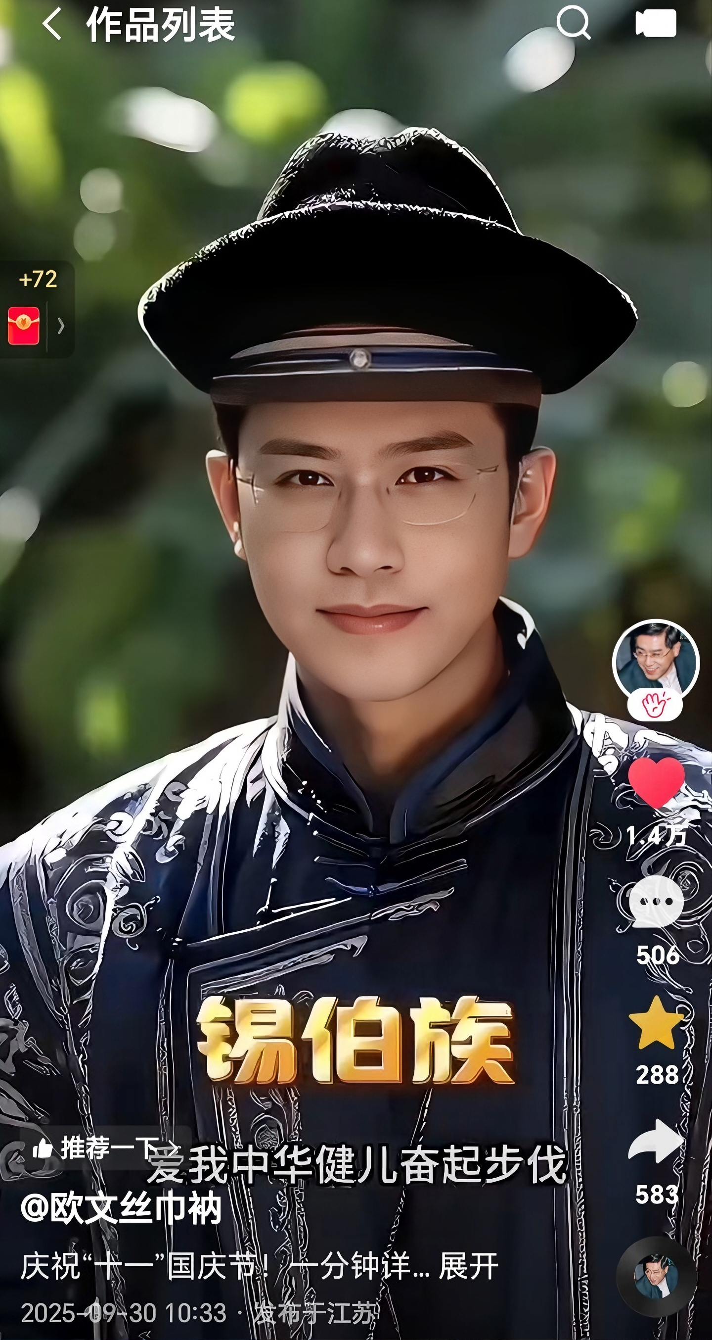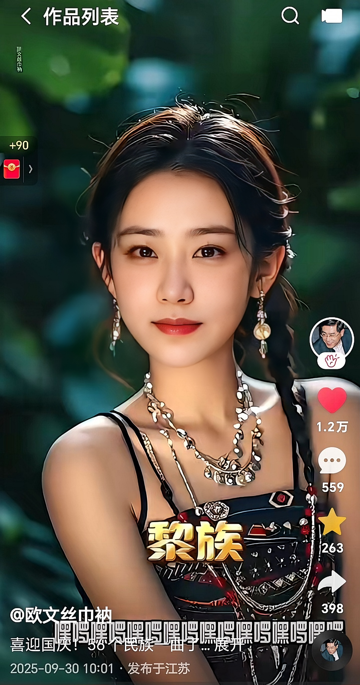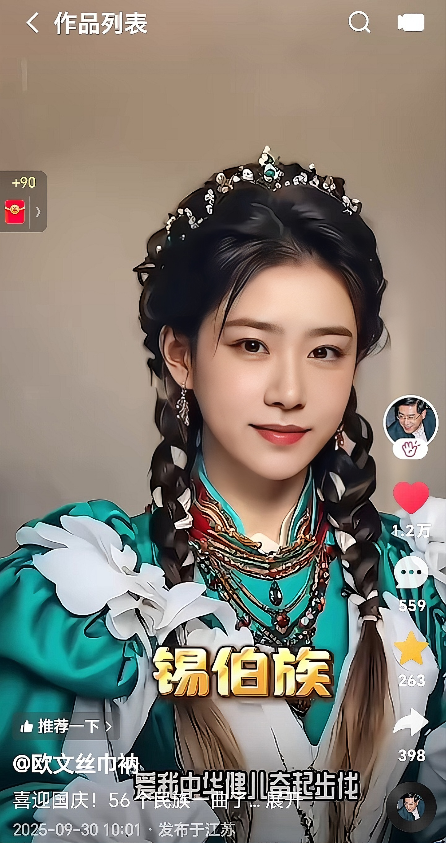 国庆期间,《一分钟详识56个民族》(男版)和《56个民族一曲了然》(女版)两个一分钟视频,伴随《五十六个民族五十六枝花》的熟悉歌声屡上热门,全网播放近50万次,点赞、评论、收藏、转发、弹幕逾四万人次,好评连连。视频作者是跨界心理学家欧文丝巾衲,男版和女版均由其个人AI形象生成,被称为“56对民族玛姆斯”