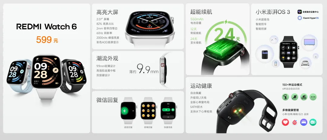 续航方面,550mAh大电池带来至长24天超长续航,常规使用可达12天。全新小米澎湃OS 3实现表端控车、米家互联、小米超级岛,支持SU7/YU7等多款NFC车钥匙,以及表端微信消息收发与回复。支持心率、血氧、睡眠、压力、女性健康管理,内置呼吸训练功能,结合专业指导与细腻振感,助力身心放松。支持150+运动模式,5ATM防水,GNSS独立定位,双L1天线精准导航,全面满足运动与日常使用需求。REDMI Watch 6,以旗舰配置与智能交互,开启健康时尚新生活,售价 599 元,发布会后正式开售。