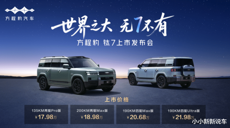 9 月 9 日,比亚迪方程豹品牌再添重磅新品,被誉为 “大五座天花板” 的方程豹钛 7 正式上市。此次新车推出 4 个配置版本,售价区间 17.98 万元 - 21.98 万元,不仅以极具竞争力的价格击穿市场壁垒,更凭借 “面子、里子、乐子” 三位一体的产品力,打破硬派与家用的二元对立,为追求品质生活的家庭用户带来全新选择。