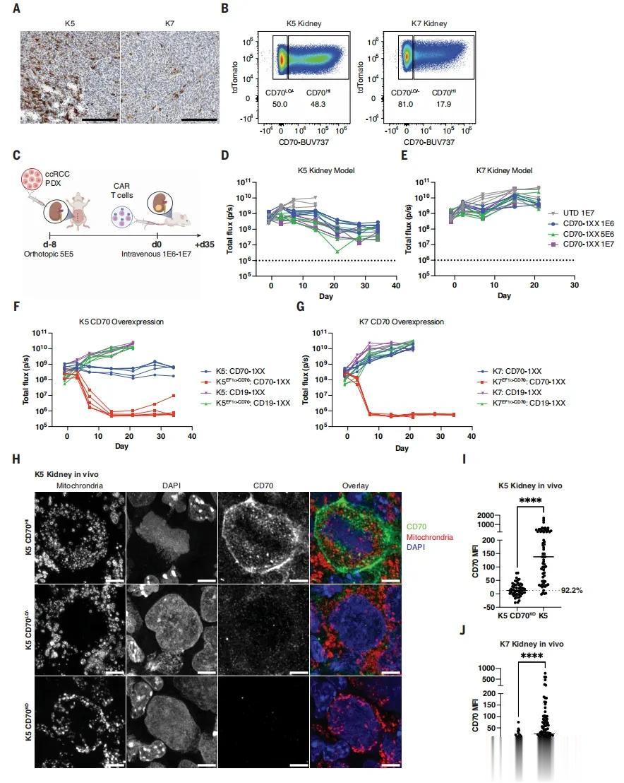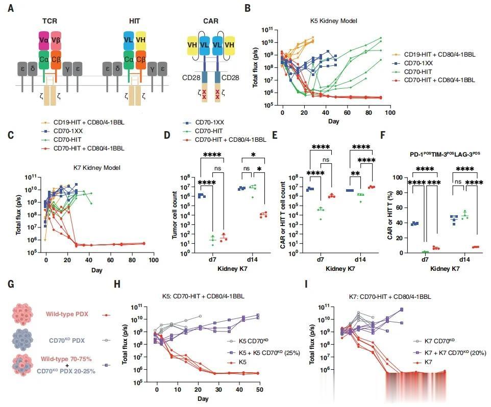 随后,研究人员在动物体内对比了HIT-T细胞和CAR-T细胞治疗的效果。在肾癌PDX模型中,K5模型(约50%细胞高表达CD70)经传统CAR-T治疗仅能延迟肿瘤进展,更凶险的K7模型(约18%细胞高表达CD70)则完全失效;而HIT-T细胞治疗后,肿瘤持续消退,长期无复发。