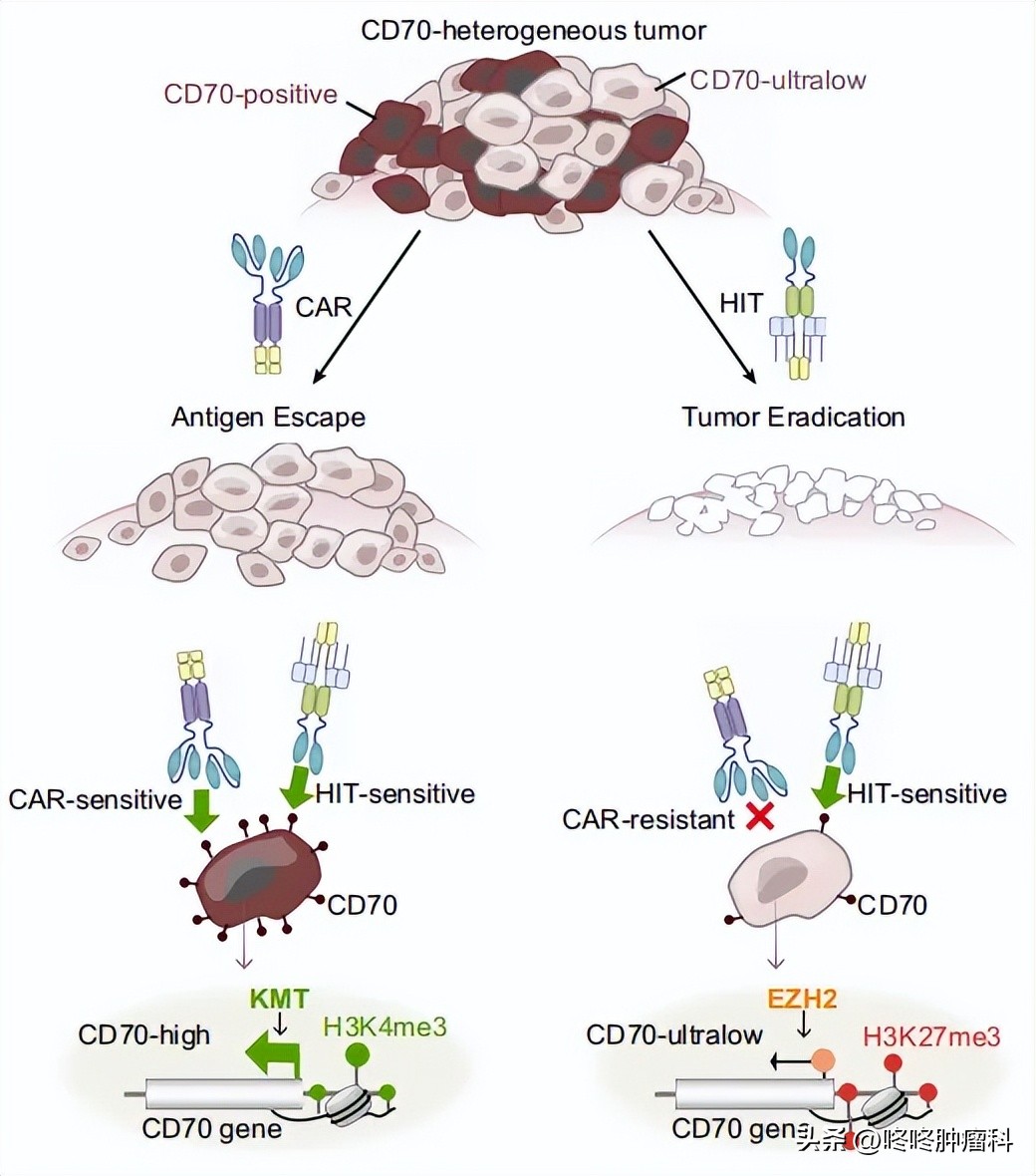 而传统CAR-T只能清除高表达CD70的癌细胞,对「识别盲区」的「阴性」肿瘤细胞束手无策,这些「漏网之鱼」最终会引发复发转移。那么,构建一种基于更灵敏受体的CAR-T细胞,是不是就有可能清除整个肿瘤呢?