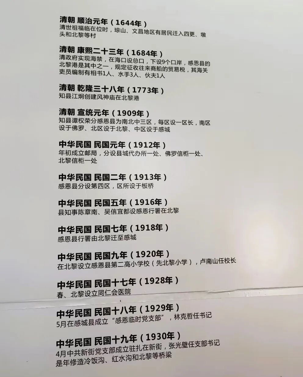 据记载:北黎村始建于汉,初名长兴。居住的全是俚人。隋置感恩县,它在感恩县北面;又以唐宋之后,“俚”、“黎”相通,故称俚人为黎人;而称黎人居住的村子为北黎村。