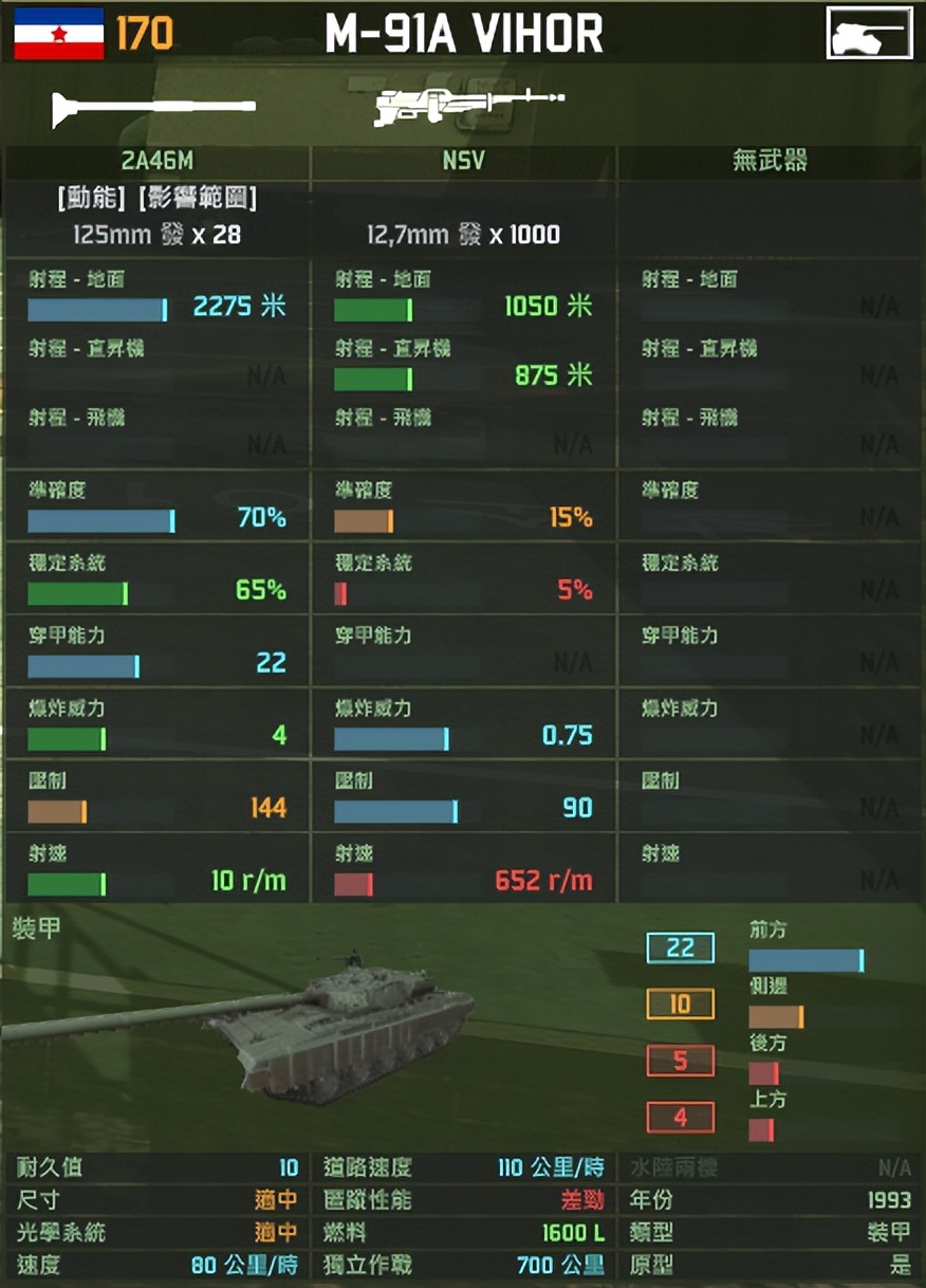 高端坦克:正甲>19、具备高准度移动射击能力、火炮穿深≥21、具备高机动性。以南斯拉夫M-91A坦克为例,据称现实中该坦克正面装甲相当于500mmRHA,在对抗破甲弹时,车体正面防护可达600mm RHA。在《红龙》中,该坦克的“前方”甲值被赋值为22点。