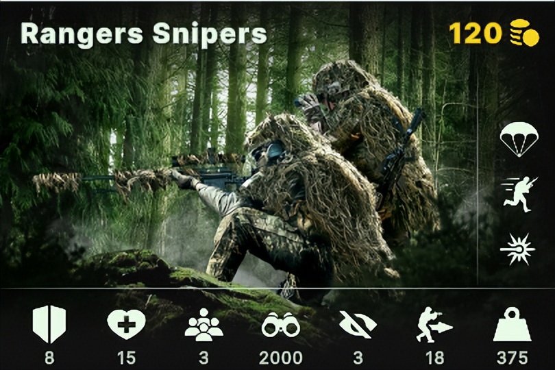 1.侦察步兵:隐蔽性高,但移动速度较慢,可以在更靠近前线的地方抵近侦察。《断剑》中侦察步兵兵牌下方图标所表示信息从左到右依次为:防御力、血量、人数、视野、隐蔽、前进速度、重量。其中,部分数值信息含义为:人数值为3代表该兵牌表征侦察步兵3人,视野值为2000代表该侦察步兵可以对周边2000米范围区域进行观察,前进速度值为18代表该侦察步兵的速度为18千米每小时,重量值为375代表这三名侦察步兵的自身体重加装备的总质量为375千克。