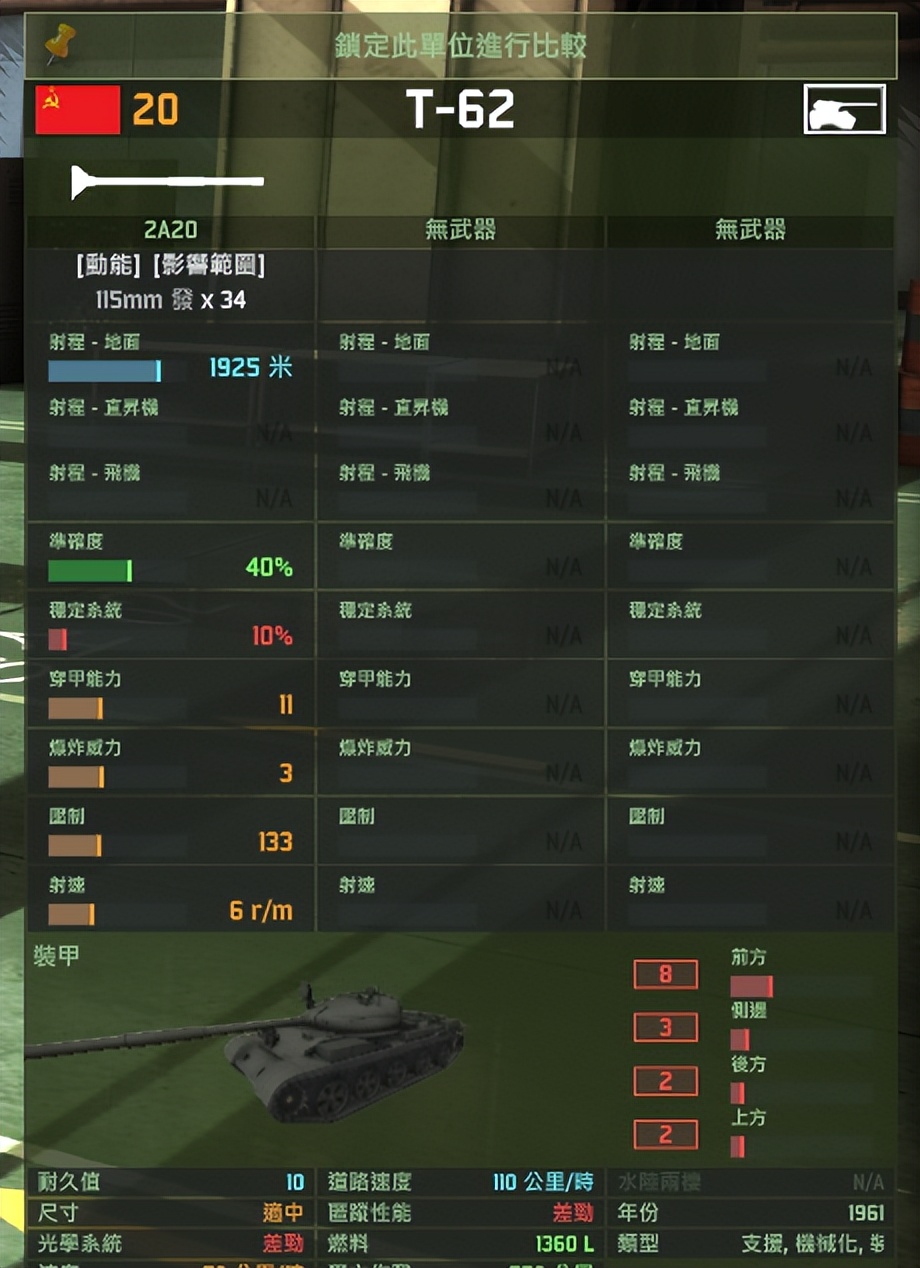 低端坦克:正甲<13、火炮不具备稳定器、火炮穿深较低。以苏联T-62坦克为例,现实中,该坦克车首由两块轧制装甲板组成,以合理倾角布置,上部前装甲厚度为102毫米,下部为100毫米。在《红龙》中,该坦克的“前方”甲值被赋值为8点。