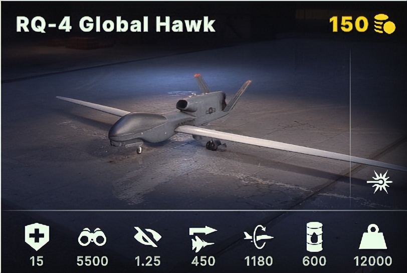 出于游戏性考量,空中侦察单位的有效侦察距离被大幅缩短。在《断剑》中,“全球鹰”仅拥有5.5km的侦察视野(地图大小约20km×20km),飞行速度450km/h。RQ-170则拥有4.5km的侦察视野且具备隐身能力,这使其能在敌方无制空权且雷达未开机的情况下,切入战线中部乃至后方进行侦察。