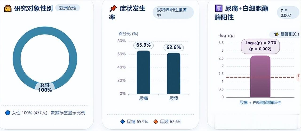 在国际研究方面,2019 年发表于《家庭医学》的亚洲女性横断面研究显示,457 名平均年龄 38 岁的患者中,尿痛出现在约 65.9% 的尿培养阳性患者,尿频出现在 62.6%,且尿痛联合尿液白细胞酯酶阳性时对诊断尿路感染具有显著价值(p=0.002),说明症状结合实验室指标可提高诊断信心。