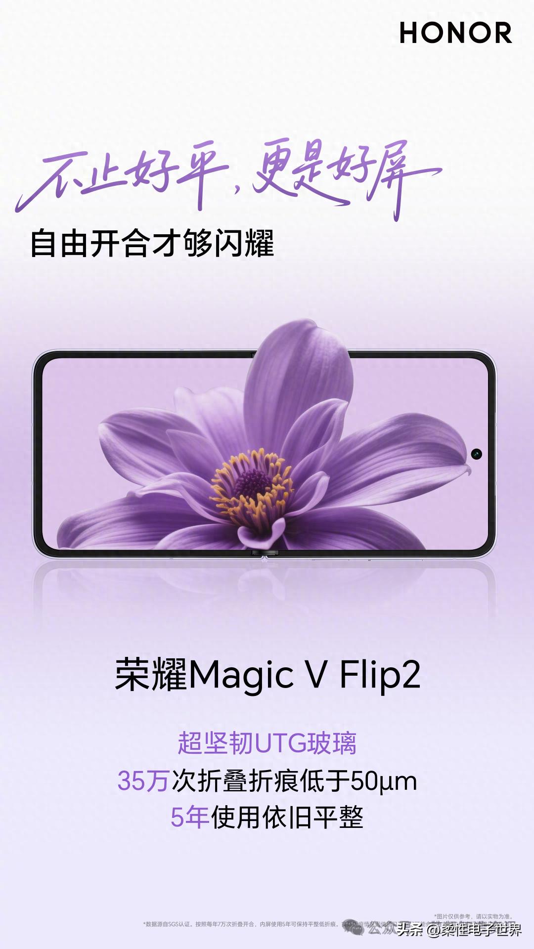 据悉,荣耀Magic V Flip2在内屏配备了50μm超坚韧UTG玻璃,通过SGS高品质耐久折叠认证,具备内屏抗冲击,整机抗跌耐摔等特点,可以实现50万次耐久折叠,5年长效平整。