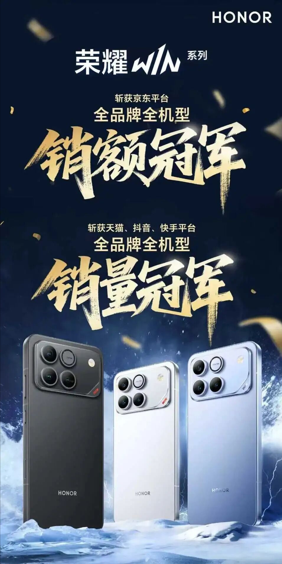 更令人意外的是,这场看似实力悬殊的“对决”却出现了戏剧性的反转——荣耀WIN系列不仅热度超越了小米旗舰,更在开售后迅速登顶多个渠道的销量冠军,成为了年底手机市场的最大黑马。