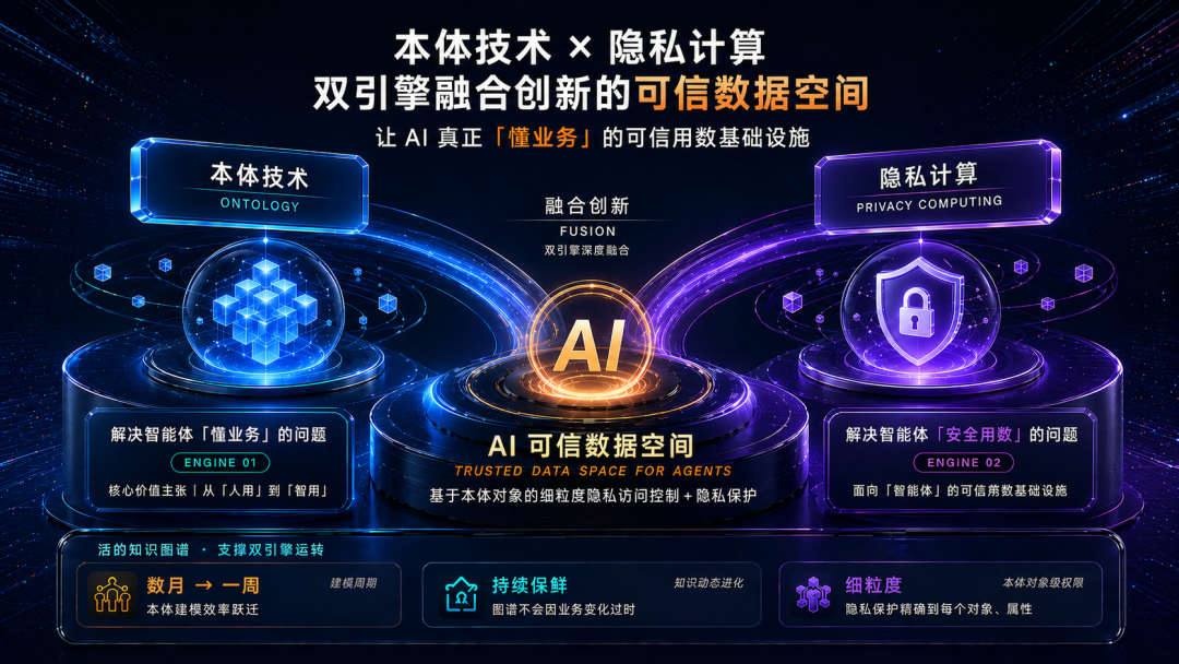 AI可信数据空间2.0,本质上是让AI能真正“懂业务”的可信用数基础设施。童玲介绍说,产品首次实现了本体和隐私计算两大核心技术的深度融合,基于本体的技术,解决智能体懂业务的问题,隐私计算技术解决“安全用数”的问题,这两个问题解决了,才敢让智能体“上生产”。