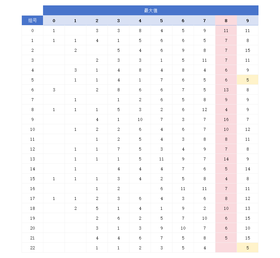 最后,我们还可以观察下最大值是9的情况,第22组出现过5次,和历史最少次数持平,未来会有不少出的机会的。