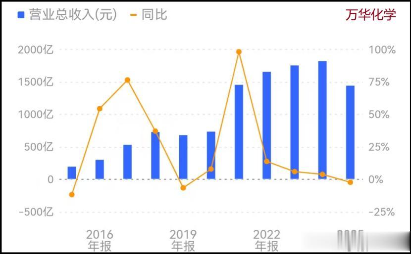 从营收维度看,万华化学2024年年报数据显示,公司全年营收规模达1821亿元,同比小幅增长3.83%;而据2025年三季度报披露,其前三季度营收合计1442亿元,同比下滑2.29%。这意味着2025年营收端的负增长,成为继2019年(营收同比-6.57%)周期低谷之后,公司迎来的又一轮营收周期性回调。