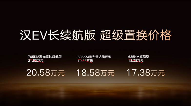 其中,汉 DM-i长续航版纯电续航提升至 245 公里,亏电油耗仅 3.44L/100km,补贴后官方指导价为 15.98 万-18.98 万元;汉 EV 长续航版共推出3 款车型,续航覆盖 635km 与705km,补贴后官方指导价为 17.38 万-20.58 万元。特别提醒:上述补贴后指导价,需在 10 月 31 日前完成购车并享受 1万元超级置换补贴,属于限时优惠价格。