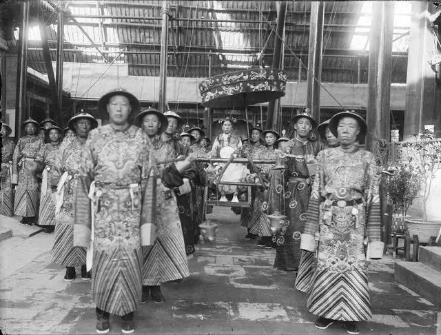 颐和园的仁寿殿前,慈禧也和太监们拍摄了十分有排场的摆驾照片,慈禧坐在轿子中,身后是伺候的众太监们。她的两个得力助手站在队伍最前方,相伴左右,右为李莲英,左为崔玉贵。