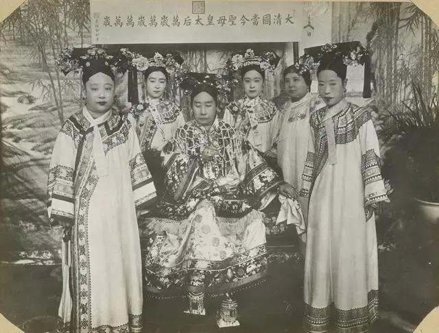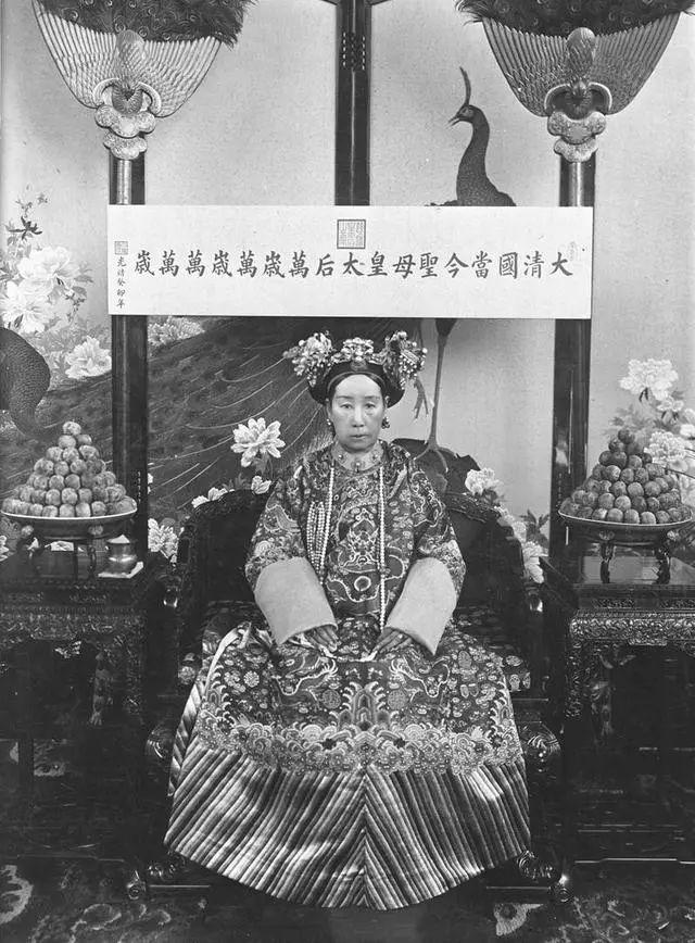 1903年到1905年间,慈禧拍摄了许多单人形象照,此时的她年近七十,衣着端庄大气,表情严肃,略显刻薄。身后树立凤凰屏风,前书字牌“大清国当今圣母皇太后万岁万岁万万岁”。