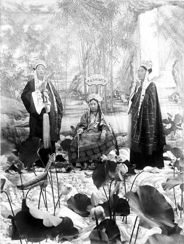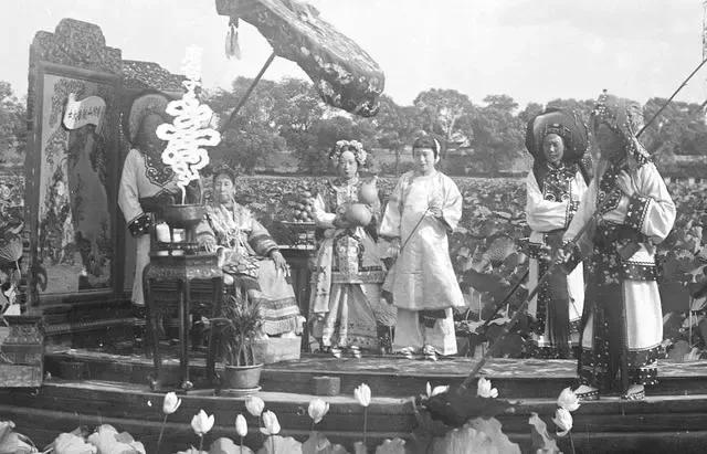 清内务府档案记载:七月十六日海里照相,众人乘坐平船,不带船篷。四格格扮善财童子,穿着莲花衣,站在慈禧下位。李莲英扮作韦驮天尊,头戴韦陀盔、身着配套的行头。三姑娘、五姑娘扮作撑船的仙女,脸上有渔家罩,穿白色裙子,带这该有的行头,红色绿色都可以。船上桨要两个。让花园预备十几根带竹叶的竹竿。让三顺预备这些,初八那天要备齐,呈览。
