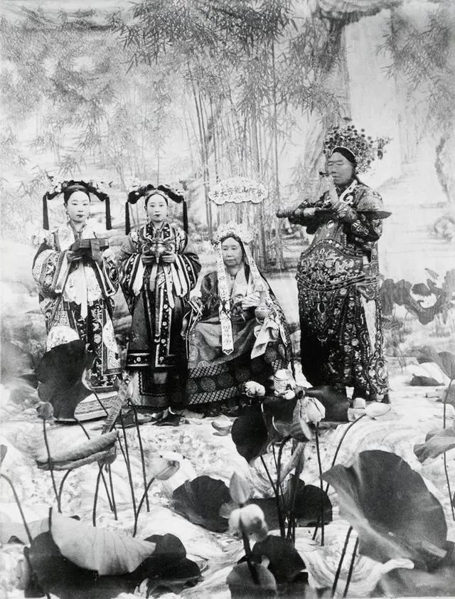 慈禧与后宫佳丽合影。因身份地位原因,慈禧坐在正中央,其他嫔妃环绕四周,分别是光绪皇后、瑾妃、德龄、容龄、裕庚夫人。