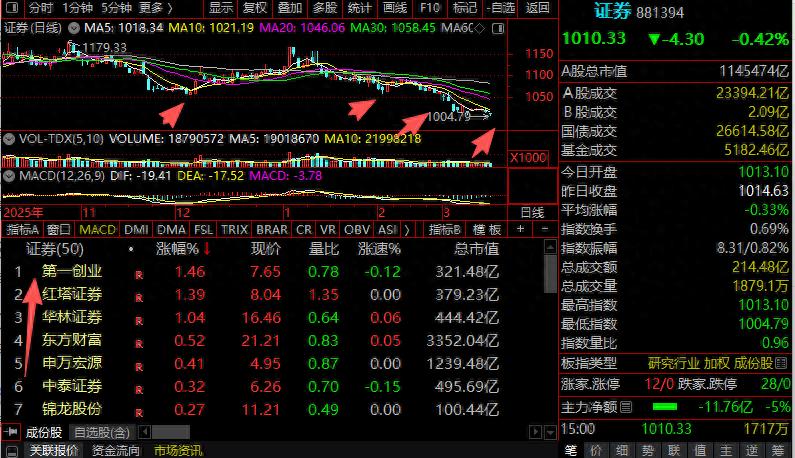 券商今日低开,开盘直接跳水,探至前方(去年6月25日的大阳线)的支撑位附近(1004.79点)回升,但全天水下运行。日K线“两连阴”,实际已连跌三日。板块内12家飘红,为第一创(今日“头羊”),红塔、华林、东财、中泰、申万、首创等。