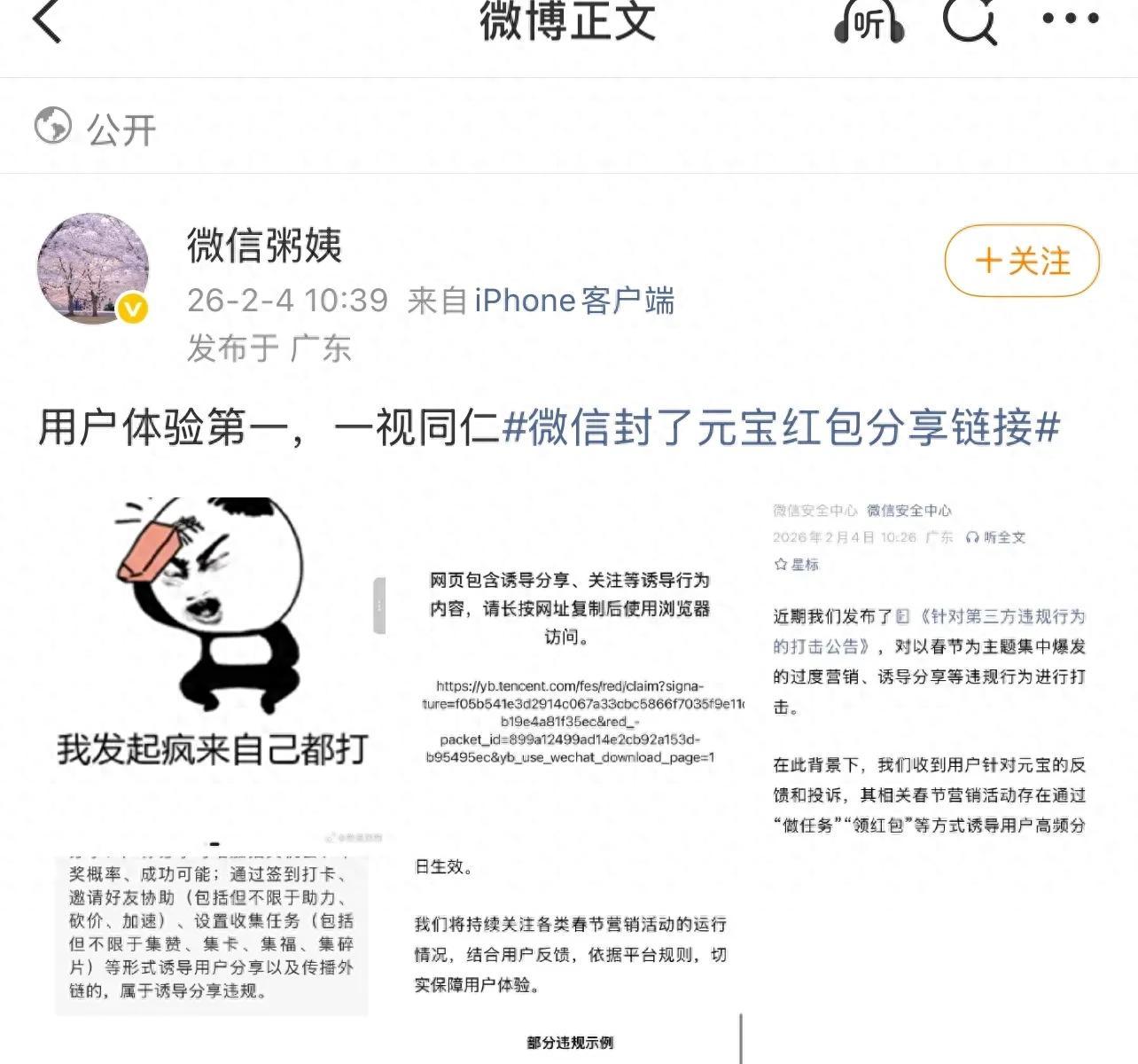 微信安全中心今天发布公告:收到用户针对元宝的反馈和投诉,其相关春节营销活动存在通过“做任务”“领红包”等方式诱导用户高频分享链接到微信群等场景,干扰平台生态秩序、影响用户体验、对用户造成骚扰。