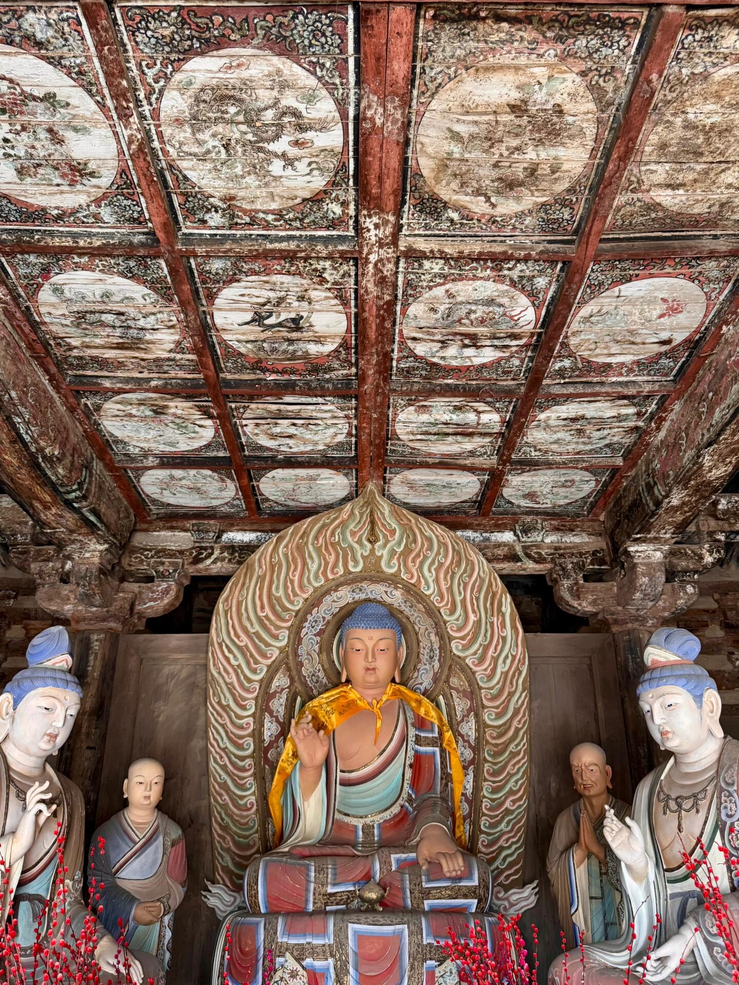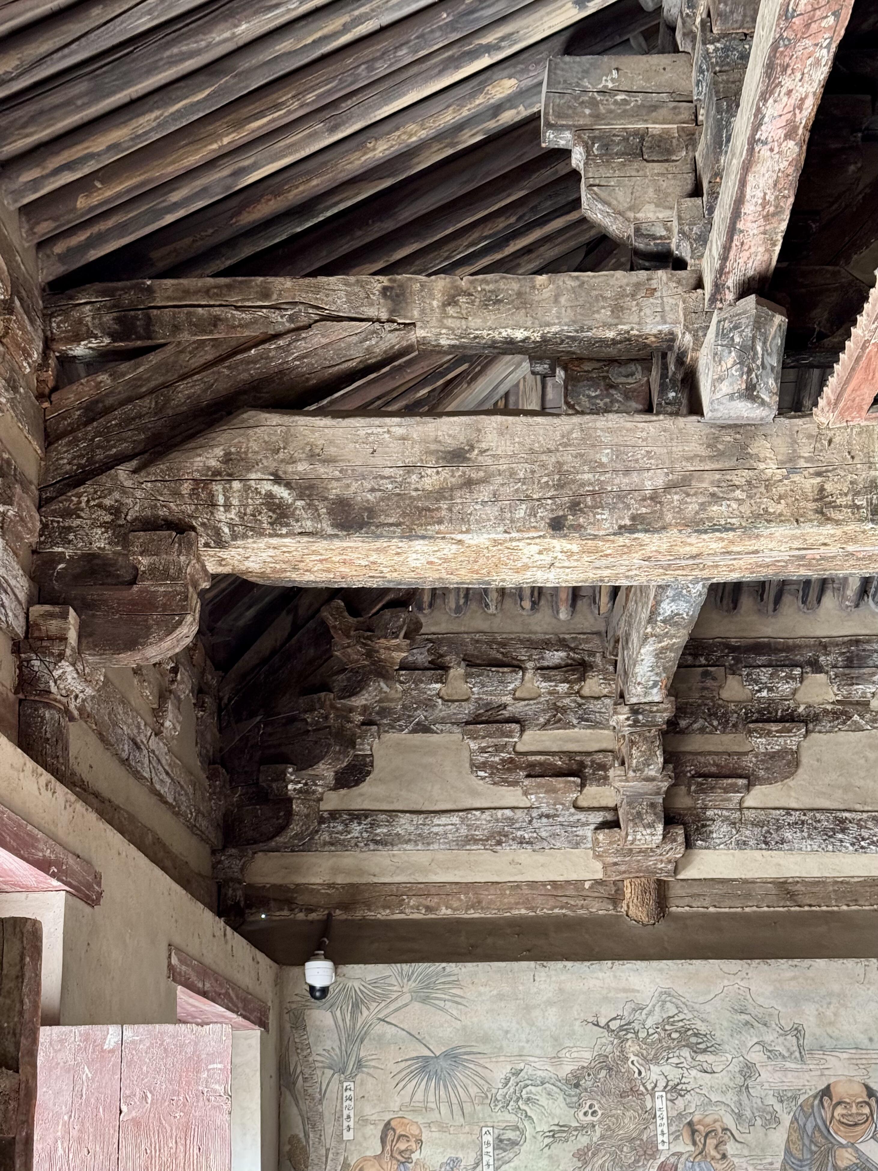 走进殿内,梁架的"裸露美学"让人震撼。没有天花遮蔽,所有木构构件一目了然:两根通长的大梁横跨殿内,与平梁间的十字斗拱隔架形成稳固的三角结构。这种隔架斗拱采用"驼峰+斗拱"的组合,驼峰刻成莲瓣形,斗拱则为一斗三升,既具承重功能,又富装饰美感。更妙的是丁栿(山面梁架)与系头栿(横向梁架)的交汇处,同样用十字斗拱连接,形成"四维受力"的力学奇迹,即便经历20世纪的多次地震,殿内梁架仍无明显位移。