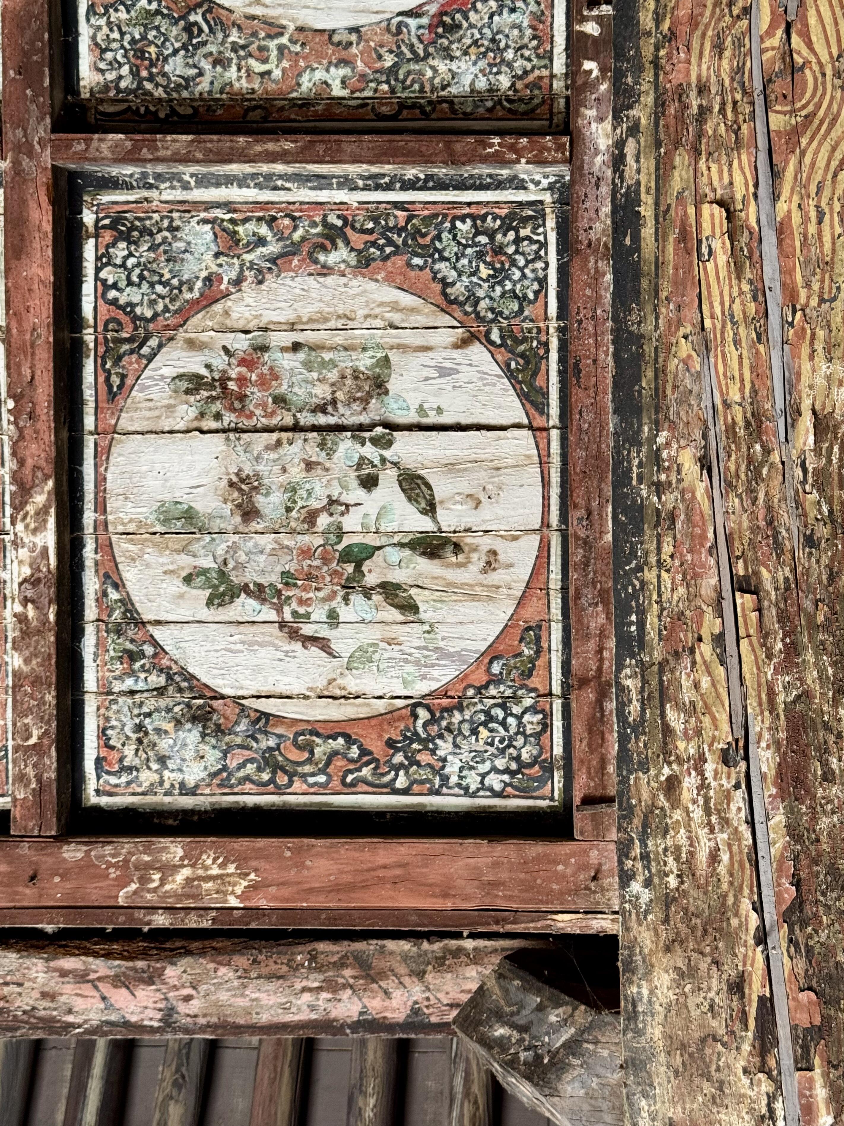 天花板上的彩画是另一个惊喜。虽然为明清时期重绘,但"喜鹊登梅"的灵动、"麒麟献瑞"的庄严、"游龙戏凤"的飘逸,仍可窥见古代画工的精湛技艺。最特别的是"凤穿牡丹"图,凤凰的尾羽采用"沥粉贴金"技法,虽历经百年氧化,仍在阳光斜射时闪现金线,这种皇家建筑才有的装饰手法,出现在乡村小庙中,暗示着碧云寺可能有过不寻常的过往。