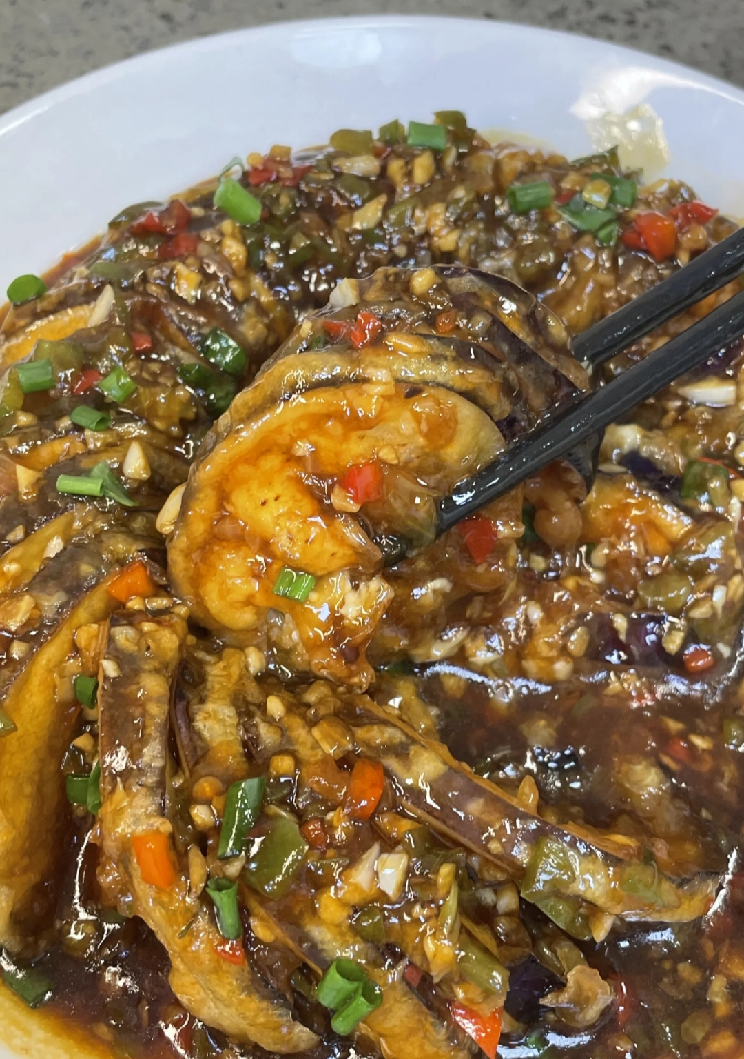 关于鱼香茄龙的起源,其实并没有确切的记载,但它绝对是川菜智慧的代表之一。据说,它是由传统的“鱼香茄子”演变而来。某位聪明的厨师为了让茄子更入味、造型更惊艳,独创了这种切法,让普通的茄子瞬间“化身为龙”,成了一道宴客桌上的明星菜。